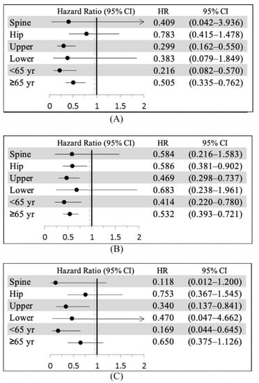 Forest plot of (A) second fragility fracture, (B) second fragility fracture surgery, and (C) revision surgery in patients with bisphosphonate initiation within 3 months after fragility fracture surgery versus more than 3 months after fragility fracture surgery for different fragility fracture types and age groups. SHR, subdistribution hazard ratio; CI, confidence interval; Upper, upper limb; Lower, lower limb.