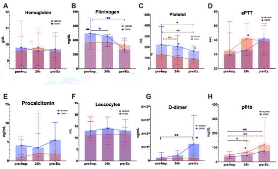 Time course of laboratory parameters. * p values < 0.05, ** p < 0.01 are significant and tagged with asterisks. Black asterisks indicate significance between the COVID and NCOVID groups. Colored asterisks show significance between two-time points. COVID group: n = 19; NCOVID group: n = 34. Abbreviations: aPTT—partial thromboplastin time; pfHb—plasma-free hemoglobin; pre-imp—pre-ECMO implantation; pre-Ex—pre-ECMO explantation.
