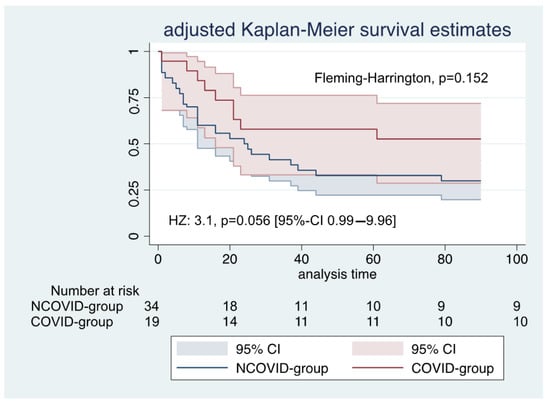Table 2 presents all outcomes and complications. During a 90-day follow-up, mortality was 47% in the COVID group and 74% in the NCOVID group (Fleming–Harrington test of equality of survival, p = 0.153). Figure 2 presents the Kaplan–Meier survival curves weighted for propensity score.