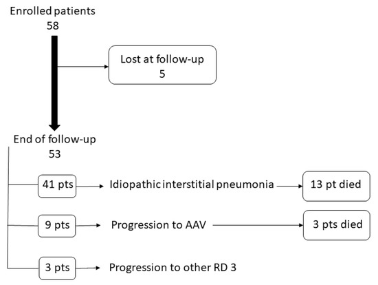 Lung function and CT imaging variations were recorded for the observation period available for each patient. An absolute decline >10% of the forced vital capacity (FVC) or >15% of the lung diffusion capacity of CO from baseline were considered clinically significant [12]. Improvement, worsening, or stability of chest HRCT was evaluated according to the percentage of involvement of the lung parenchyma [15]. Main disease-specific treatments, including immune-suppressants and anti-fibrotic agents, were recorded as well. The end of the follow-up was set at the last available visit or when progression to AAV or death occurred. A patient was defined as lost to follow-up when he/she had no follow-up visit or when the follow-up duration was lower than 12 months. At the end of follow-up, all diagnoses were discussed in a multidisciplinary discussion involving rheumatologist and pulmonologist.