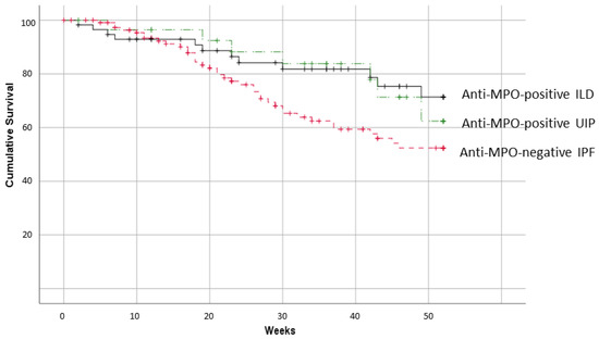 Finally, the median survival time for ILD-MPO patients was 192 months. The overall cohort of anti-MPO-positive ILD patients had a better 52-week survival in comparison with 116 age-matched reference IPF cases (71.4 ± 7.5% vs. 52.4 ± 5.9% for anti-MPO-positive ILD patients and IPF, respectively; p = 0.045). Conversely, no survival differences with IPF were observed when looking at MPO-positive ILD patients with a chest CT pattern of UIP (62.4 ± 12.3%; Figure 2).