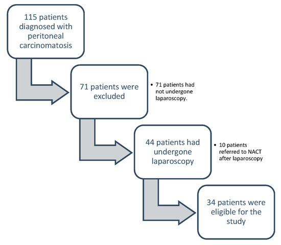 Between 2013 and 2017, 115 patients were diagnosed with peritoneal carcinomatosis at the University General Hospital of Castellón. The data were extracted from the database of the Multidisciplinary Unit of Abdominal Pelvic Surgery (MUAPOS). During the study period, 34 patients who underwent laparoscopy surgery and posterior cytoreductive surgery were included in the data analysis.