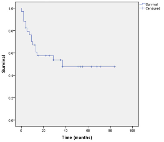 Overall survival at 5 years was 46.31 months (95% CI 33.06–69.57) (Figure 2).