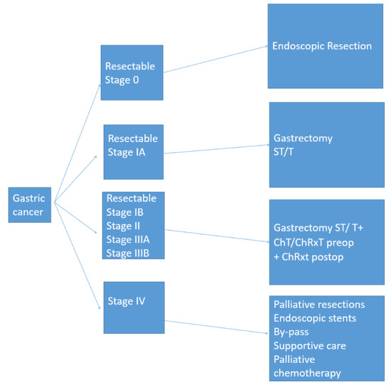 Figure 1. Treatment strategies of gastric cancer according to TNM stage. Stage 0: TisN0M0; stage IA: T1N0M0; stage IB: T2N0M0; stage II: T1N2M0/T2N1M0/T3N0M0; stage IIIA: T3N1M0/T4N0M0; stage IIIB: T3N2M0; stage IV: T3N1-3M0/T1-3N3M0/T1-4N0-3M1 (Tis—the mucosa; T1—submucosa;T2—muscle layer; T3—subserosa; T4—serosa/adjacent structures/N0—(0+)LN; N1—(1–2+)LN; N2—(3–6+)LN; N3—(>7+)LN/M0—no metastasis; M1—distant metastasis or carcinomatosis); LN—lymph nodes; ST—subtotal; T—total; ChT—chemotherapy; ChRxT—chemo-radiotherapy; preop—preoperative; postop—postoperative.