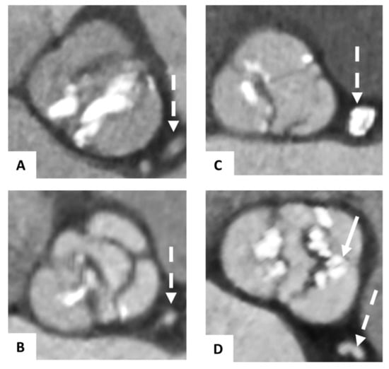 Figure 1. Classification of bicuspid aortic valves. Pre-TAVI contrast-enhanced CTA axial showing congenital bicuspid aortic valves classified according to the schema of Sievers and Schmidke with Type 0 (A), Type 1 L/R (with raphe between the left and right coronary cusps) (B), Type 1 R/N (with raphe between the right and non-coronary cusps), (C) and a functional bicuspid aortic valve (D) with secondarily fused left and right coronary cusps due to severe calcification (→). The dashed arrow (--->) is marking the left coronary artery system.