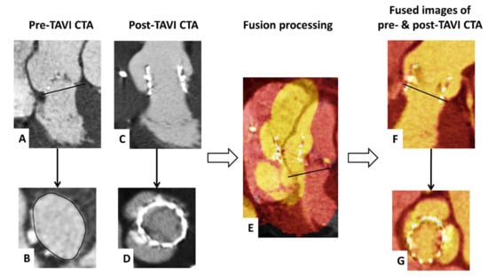 Figure 2. Visualization of fusion imaging of pre- and post-TAVI CTA. CTA axial and sagittal oblique reconstructions show the pre-TAVI images with delineating of the annulus plane (A,B) and post-TAVI images with the implanted Sapien 3 (C,D). Subsequently, the pre- and post-TAVI images were semi-automatically merged (E). Finally, the fused images were manually adapted to achieve an optimal alignment of the annular region in all reconstructions (F,G).
