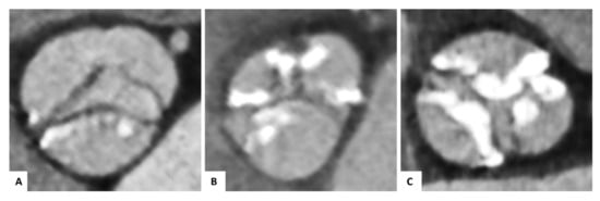Figure 3. Semiquantitative calcification assessment of the device-landing zone. Pre-TAVI contrast-enhanced CTA of congenital and functional bicuspid aortic valves for visual calcification assessment with examples for mild (A), moderate (B), or severe (C) calcification of the cusps regions.