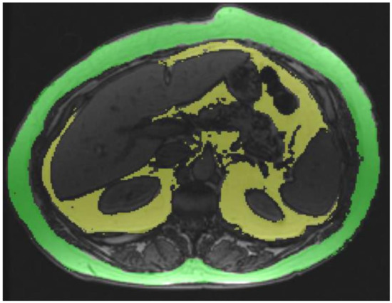 Although body mass index (BMI) is an independent predictor of NAFLD, body fat composition, particularly visceral adipose tissue (VAT), is known to have association with HS even in non-obese individuals [8]. Magnetic resonance imaging (MRI) derived proton density fat fraction (PDFF) is a non-invasive biomarker that can evaluate hepatic steatosis and correlate with the histologic grade of fatty change [9]. VAT can be easily measured using anatomic images obtained with a computerized tomography (CT) or MRI. Previous studies have shown association between VAT measured with CT and NASH; however, the results were not conclusive [10,11,12]. The ability to predict NASH from VAT with MRI is not known. An MRI may be suitable for the evaluation of both liver PDFF and VAT at the same time, which is an advantage over CT where only abdominal fat estimation can be reliably determined. In this study, we aimed to determine the association between VAT and NAFLD features in patients with known or suspected NAFLD.