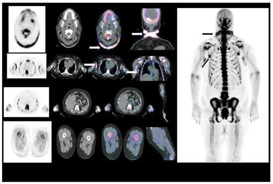 - Gutierrez-Cardo, A.; Lillo, E.; Murcia-Casas, B.; Carrillo-Linares, J.L.; García-Argüello, F.; Sánchez-Sánchez, P.; Rodriguez-Morata, A.; Baquero Aranda, I.; Sánchez-Chaparro, M.Á.; García-Fernández, M.; et al. Skin and Arterial Wall Deposits of 18F-NaF and Severity of Disease in Patients with Pseudoxanthoma Elasticum. J. Clin. Med. 2020, 9, 1393. [Google Scholar] [CrossRef] [PubMed]
