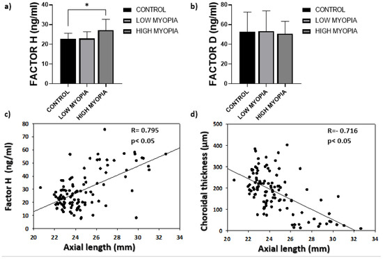 (a) The mean concentrations of complement Factor H. Values are expressed as mean ± SD. The difference in means (*) was established at a significance of p ˂ 0.05; (b) the mean complement Factor D concentrations; (c) the correlation analysis between eyeball axial length and the measured complement Factor H concentrations; (d) inverse correlation between eyeball axial length and choroid thickness measured by OCT.