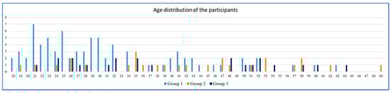 In total, 847 legal guardians of persons with intellectual disability occupied in sheltered workshops were asked for their consent to the dental examination of their wards. In addition, they were requested to complete a prepared questionnaire. Consent for the dental examination was obtained for 137 persons (16.2%). The questionnaires were completed by 161 persons (19.0%). For the present study, the data of 132 (15.6%) persons with intellectual disability, aged between 18 and 69 years, could be included because both the dental record and a completed questionnaire were available. The average age of the included participants was 35.2 years old (SD 12.7). The proportion of men was 49.2%. The majority (61.4%) of the study participants were living with their parents or other family members. Further figures to characterize the study group are presented in Table 1. The mean age of the members of the three groups ranged from 31.2 to 42.0 years (Table 2). In these groups, the age distribution differed distinctly, as Group 1 was dominated by 18–32-year-olds, while Group 3 consisted of persons between the ages of 21 and 37 years and persons between the ages of 48 and 64 years (Figure 1).