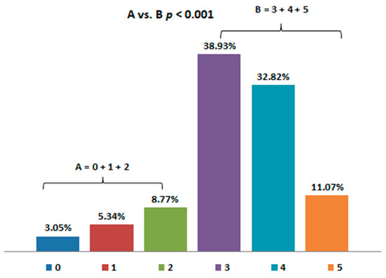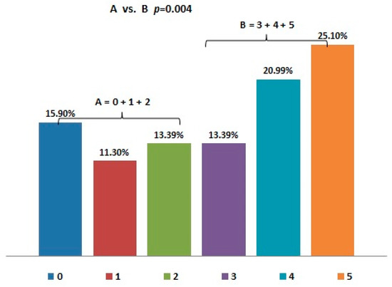 Patients’ self-assessment of knowledge about the impact of air pollution on health (from 0—lack of knowledge to 5—very extensive knowledge). The study group was divided into two subgroups. Group A consisted of patients declaring lack of knowledge, very poor, and poor knowledge about the impact of pollution on health, while group B consisted of patients who declared good, very good, or excellent knowledge on this subject.
