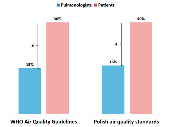 Declared knowledge of WHO and Polish air quality standards by patients and pulmonologists (* p < 0.001).