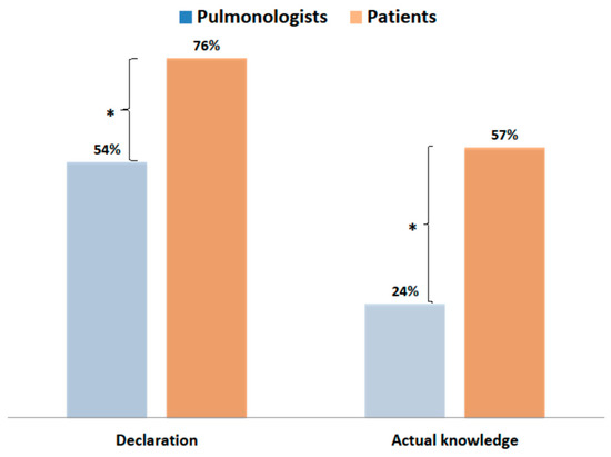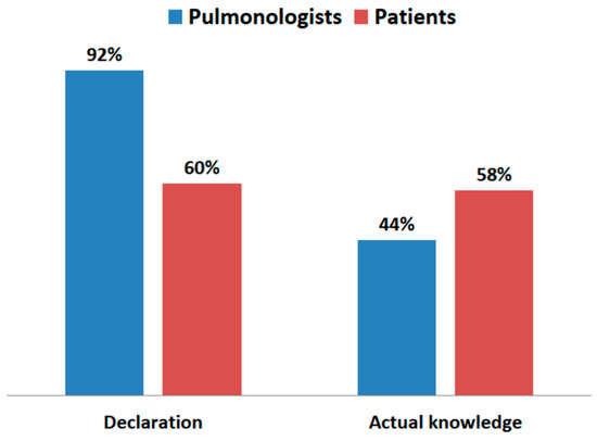 Patients’ declared and actual knowledge about the main sources of air pollution in their areas was much higher (p < 0.001) than the knowledge of pulmonologists (Figure 6).