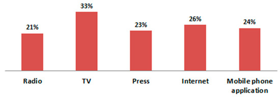 Only 27.5% of the pulmonologists declared that they were following information on the level of air pollution in their area, and 16.5% of them were informing their patients about the consequences of air pollution on their health. Meanwhile, as many as 65% of patients systematically followed information on the quality of air in their regions and carried out their activities depending on them. Although the most common source of information about the current level of air pollution was TV, one-fourth of the patients who kept abreast of the concentration of pollution used an application on their mobile phones (Figure 7). As many as 69% of patients declared knowledge regarding methods of protection against air pollution. Thirty percent of the surveyed patients had an air purifier with a HEPA filter at home, and 5% of the patients used protective masks when leaving the house during periods of smog.