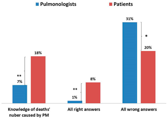 Patients’ and pulmonologists’ global knowledge about the impact of air pollution (*, ** p < 0.001).