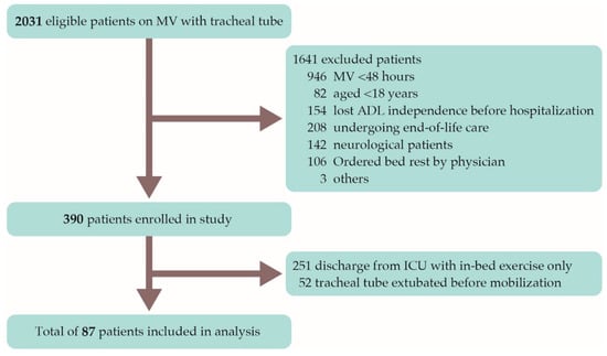 The subjects of this study were 2031 tracheally intubated patients on mechanical ventilation who were admitted to the ICU at a participating hospital between January 2017 and March 2018. Using previous study for reference, inclusion and exclusion criteria were carefully defined []. The study excluded patients who were mechanically ventilated for less than 48 hours in the ICU; patients aged under 18 years; patients who had lost ADL independence before hospitalization; patients receiving end-of-life care; neurological patients; and patients ordered bed rest by their physician. Of the 390 patients enrolled in the study, patients who were discharged from the ICU with in-bed exercise only and patients who were extubated prior to active mobilization were withdrawn from the study, and the remaining 87 patients were analyzed (Figure 1).