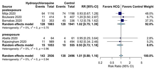 We focused our systematic review on controlled studies where hydroxychloroquine was used specifically for pre- or post-exposure prophylaxis against COVID-19. There are several reasons why we did not allow studies where the experimental group was receiving hydroxychloroquine for the treatment of autoimmune diseases where the subsequent development of COVID-19 was assessed vs. a control group. Patients with autoimmune diseases that are treated with hydroxychloroquine may have a different susceptibility to COVID-19 than those without autoimmune diseases, and the other pharmacotherapeutic options for autoimmune diseases used in the experimental and the control groups might also impact the development of COVID-19 in a positive or negative fashion. Additionally, given hydroxychloroquine’s complex pharmacokinetics (specifically its distribution time into different tissues and its prolonged elimination half-life) [], the long-term nature of hydroxychloroquine use for autoimmune diseases before exposure may yield tissue concentrations of hydroxychloroquine at the time of exposure that are not achievable with prophylactic use for COVID-19.