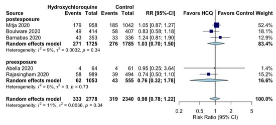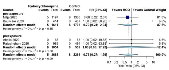 We reported our systematic review according to the 2009 PRISMA statement []. Dichotomous outcomes were described with numbers and proportions, and continuous outcomes with mean and standard deviation or median and interquartile range (IQR). Inverse variance random effect meta-analyses were performed to evaluate the effect of hydroxychloroquine vs. control on outcomes when outcome data were available for at least two RCTs judged to have homogeneous study characteristics. Effects of meta-analyses were reported as relative risks (RR) and their 95% confidence intervals (CIs); a 95% CI including the number 1 in its range meant no difference of outcome effect between hydroxychloroquine and control arms. Data of two arms of hydroxychloroquine from one RCT were combined into one. CIs of effects were adjusted with the Hartung–Knapp method [], and the between study variance tau2 was calculated with the Paule–Mandel method. The treatment arm continuity correction method was used to account for zero outcome events in one or two arms of studies. Heterogeneity of effects among studies was quantified with the I2 statistic (an I2 > 60% means high heterogeneity). We pre-specified subgroup analyses by type of design (RCTs and cohorts) and by type of prophylaxis (pre-exposure vs. post-exposure); the p for an interaction test < 0.05 indicated effect modification by subgroup. The meta package of R 3.5.1 (www.r-project.org, accessed on 17 February 2021) was used for meta-analyses. The quality/certainty of evidence was evaluated using the GRADE methodology, which covers 5 items: risk of bias, inconsistency, indirectness, imprecision, and publication bias []. Quality of evidence was evaluated per outcome and described in summary of findings (SoF) tables; GRADEpro GDT was used to create SoF tables [].