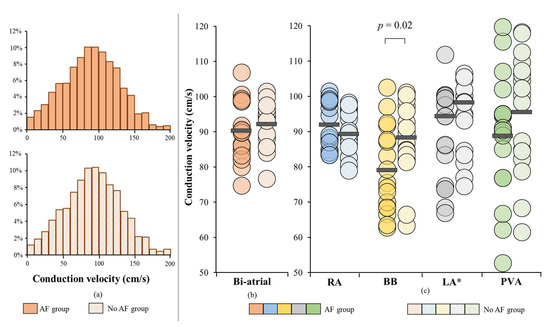 Figure 2. CV in patients with and without a history of AF. (a) biatrial CV histograms of patients with and without a history of AF; (b) biatrial median CV displayed for each patient (c) median CV displayed for each patient per region separately. *Non-normally distributed. cm/s = centimeter/second; CV = conduction velocity; AF = atrial fibrillation; BB = Bachmann’s Bundle; LA = left atrium; PVA = pulmonary vein area; RA = right atrium.