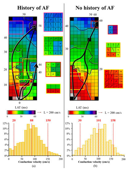 We only evaluated regional differences in CV between patients with and without AF and not specific areas within each region. As previously mentioned, CV is determined, among other things, by wavefront geometry and muscle thickness [1,2]. The smooth, apparently uniform walls of the LA are composed of multiple layers of differently aligned myocardial fibers, with marked regional variations in thickness [28,29]. In the RA, muscular bundles are larger, e.g., the terminal crest, and as a result of the presence of pectinate muscles, the RA wall is not uniform in thickness [30]. In normal hearts, inhomogeneities are already present in both gross structure and myoarchitecture [30]. Future studies should investigate whether there is a relation between the magnitude of CV and specific anatomic features in patients with AF.