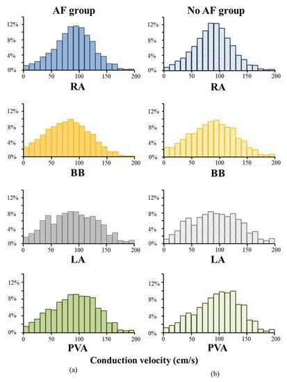 Figure 4. CV histograms of the AF and no AF group. Relative frequency distributions of CVs in the AF (a) and no AF group (b) shown for each location separately. cm/s = centimeter/second; AF = atrial fibrillation; BB = Bachmann’s Bundle; LA = left atrium; PVA = pulmonary vein area; RA = right atrium.