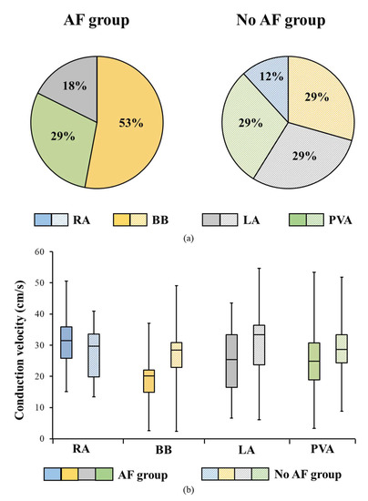 In our AF group, CV was reduced and TAT was prolonged only at BB compared to patients without AF. Previously, we determined the most accurate methodology to measure local conduction heterogeneity and, as a sub-analysis, we determined the median CV at all locations in patients with paroxysmal AF and no AF [14]. Subsequently, we also found a reduced CV at BB in patients without AF [14]. However, in that study we did not include patients with persistent or longstanding persistent AF who have varying degrees of atrial remodeling. In addition, confounders of intra-atrial conduction, such as age, body mass index and left atrial enlargement, were not considered [7,8,9]. Patients were significantly older in the paroxysmal AF group (71 ± 9 years vs. 66 ± 10 years, p < 0.001) and more patients had left atrial enlargement (41% vs. 19%, <0.001) [14]. Another study, performed by Zheng et al., compared the average CV at the RA and LA between patients with paroxysmal AF and control patients with respectively atrioventricular nodal re-entry tachycardia and Wolff-Parkinson White syndrome using three-dimensional endocardial mapping [6]. In that study, a history of AF was associated with a reduced CV at both locations which was more pronounced at the LA than the RA [6]. Remarkably, CV was much lower than our findings in the AF group (LA: 50 cm/s vs. 94 cm/s; RA: 60 cm/s vs. 92 cm/s). To estimate CV, they only compared a triplet of sites, when we computed, for each atrial potential, an average of velocity estimations between all eight adjacent electrodes [6,14]. Furthermore, those triplet numbers of locations were not measured simultaneously during the same beat, as we did in our study with the 128- or 192 electrode array [6]. It is likely that the CV measured in our study population is more accurate and therefore did not show a difference in CV at the RA and LA between patients with and without AF. In addition, no measurements were made of the PVA and BB and the study population was underpowered with only six paroxysmal AF patients for comparison [6].