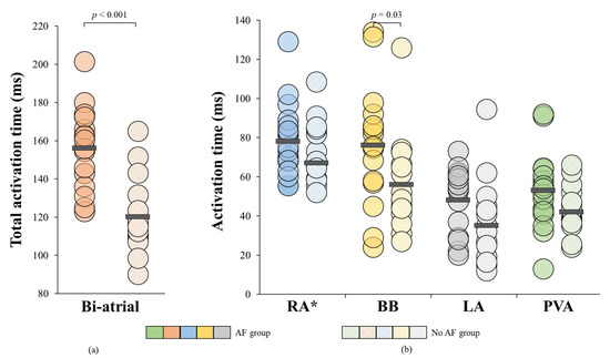 Figure 6 illustrates for each patient the TAT (a) and the TAT per region separately (b). AF was associated with a prolonged TAT (156 ± 21 ms vs. 120 ± 22 ms, p < 0.001) and TAT was particularly prolonged at BB (76 ± 31 ms vs. 58 ± 23 ms, p = 0.03).