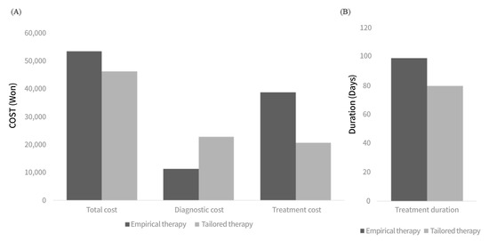 The total medical cost and treatment duration in patients on tailored therapy vs. empirical therapy (A) The total medical cost consisting of diagnostic and treatment cost in patients treated with tailored and empirical therapy. (B) The duration of treatment for each ultimately successful eradication in patients treated with tailored and empirical therapy.