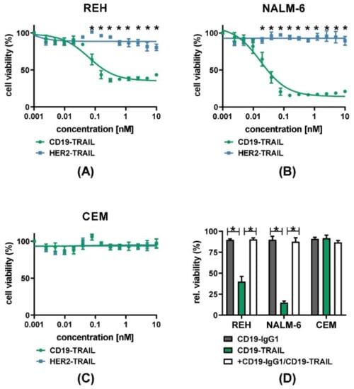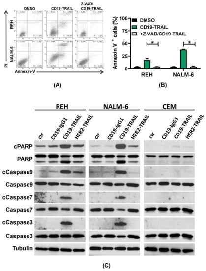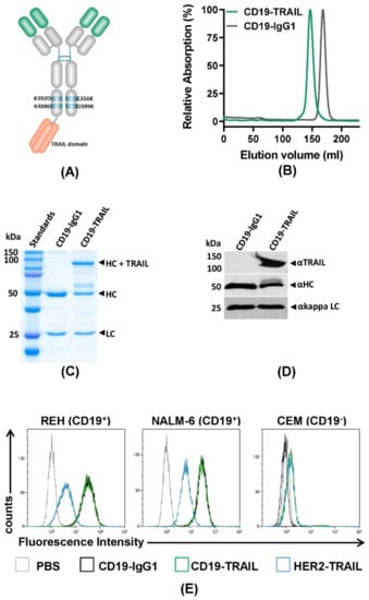 - Stieglmaier, J.; Bremer, E.; Kellner, C.; Liebig, T.M.; Cate, B.T.; Peipp, M.; Schulze-Koops, H.; Pfeiffer, M.; Bühring, H.-J.; Greil, J.; et al. Selective induction of apoptosis in leukemic B-lymphoid cells by a CD19-specific TRAIL fusion protein. Cancer Immunol. Immunother. 2008, 57, 233–246. [Google Scholar] [CrossRef]