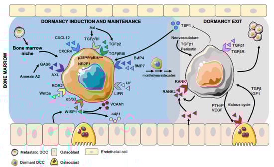 Other changes in the microenvironment of tissues harboring DCCs may also cause reactivation or escape of dormant cancer cells from dormancy, leading to overt metastasis [7,82]. One of the earliest studied aspects of the induction and reactivation of dormant cancer cells was the extracellular matrix (ECM), and it was shown that the association of the urokinase plasminogen activator receptor (uPAR) with α5β1 integrin activates the MEK/ERK pathway and plays an inhibitory role in cancer dormancy [83]. Bone marrow-derived cells, such as tumor-associated macrophages (TAMs) and tumor-associated neutrophils (TANs), produce ECM remodeling proteases in the tumor and release them in the metastatic microenvironment, which promotes tumor angiogenesis [41,84,85]. Vascular endothelial cells remodel the ECM through binding to the integrin receptor that enhances the formation of new vessels [86]. Ghajar et al. showed that metastatic cancer cells are often associated with the basement membrane close to a vascular niche. DCCs residing in perivascular niches, which are maintained in a dormant state by endothelial-derived thrombospondin-1, can exit dormancy because of sprouting neovasculature. These sprouting neovasculatures not only promote the exit of dormant cancer cells but also accelerate tumor growth by secreting TGFβ1 and periostin, which are tumor-promoting factors [86]. The process of osteoclastic bone resorption by osteoclasts, which leads to bone remodeling that changes the cellular composition and signaling, can cause the exit of cancer cells from a dormant state. Receptor activation of NF-kB ligand (RANKL), expressed by PCa cells, establishes a pre-metastatic niche by activating transcription factors, which control EMT, stemness, and osteomimicry [87]. It was shown that inhibiting RANK or its downstream signaling network of c-Myc/Max or c-Met reduced or eliminated skeletal metastasis in mice [88]. Cancer cells themselves induce the osteoclastic bone resorption by secreting factors, such as parathyroid hormone-related protein (PTHRP), which in turn secrete TGFβ1 that further induces PTHRP secretion. This feed-forward cycle also known as the “vicious cycle” accelerates osteoclastic bone resorption [25].
