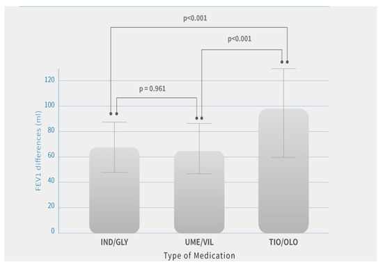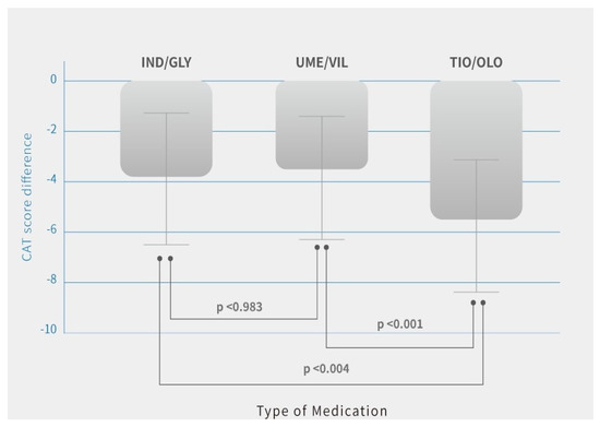 Additionally, quality of life with symptoms using CAT score improved in all three groups. The difference (pre-treatment vs. post-treatment) in patients was IND/GLY (14.8 ± 5.9 vs. 10.9 ± 6.1, p = 0.03), UME/VIL (15.2 ± 5.8 vs. 11.3 ± 5.4, p = 0.02), and TIO/OLO (15.7 ± 6.3 vs. 10.1 ± 5.1, p = 002) (Table 2). There was greater improvement in patients treated with TIO/OLO compared with IND/GLY or UME/VIL (Figure 3). CAT score decreases were more pronounced in patients with TIO/OLO treatments (−5.6 ± 2.6) than patients treated with IND/GLY (−3.8 ± 2.5) and UME/VIL (−3.9 ± 2.2) (p = 0.03) (Table 2). Therefore, the quality of life and symptoms relief were more improved in patients with TIO/OLO compared to those with the other two dual bronchodilator agents.