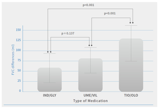 There were no significant differences observed in FEV1 and FVC changes at baseline (before the study) between patients treated with different medications. After the study, there were significant improvements in pulmonary function parameters and symptom relief in all three medications after 12 months of treatment. Among these dual bronchodilators’ treatment effectiveness, patients treated with TIO/OLO achieved greater lung function improvement compared with those with the other two dual bronchodilator agents. Patients treated with TIO/OLO had the highest FEV1 (98.7 ± 38 mL) and FVC (127.3 ± 39.4 mL) improvement compared with baseline status than those with IND/GLY (FEV1: 65.2 ± 23.8 mL; FVC: 58.2 ± 35.7 mL) and UME/VIL (FEV1: 64.4 ± 24.1 mL; FVC: 79.1 ± 35.2 mL) (p < 0.001). (Table 2). Significant differences in FEV1 and FVC improvements after 12 months of treatment were observed (Figure 1 and Figure 2). Patients treated with IND/GLY and UME/VIL did not differ significantly in terms of FEV1 and FVC improvement; however, TIO/OLO users did have significantly increased lung function parameters after 12 months of treatment (Figure 1 and Figure 2).
