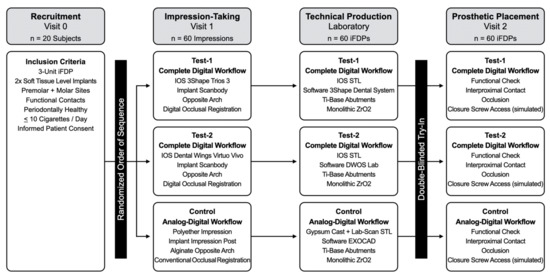 The baseline of the study was the start of the prosthetic therapy. The study involved three key stages: (i) impression-taking for clinical registration of the implants’ 3D-positioning, including antagonists and occlusal relation; (ii) CAD/CAM fabrication of iFDPs; and (iii) clinical try-in/delivery (Figure 2). Distribution of the work steps, whether beginning with Test-1, Test-2, or Control, as well as the order of sequence during iFDP try-in, were randomly chosen per study patient using the envelope-technique. The principal investigator (T.J.) performed the random allocation sequence and the enrollment of all study patients. Blinding persisted at the time of try-in/delivery of the final iFDPs to the study patients and to the clinical operator. For each of the three workflows, outcomes were evaluated according to performance of the produced reconstructions based on (i) the feasibility of laboratory cross-mounting of each iFDP; and (ii) clinical fit and assessment of adaptation time for clinical adjustments of interproximal surfaces, pontic areas and occlusal surfaces—if required.