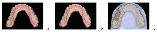 Set-up for cross-mounting displaying dental model situations with inserted iFDPs representing on study patient with 3D-printed implant models for Test-1 (a) and Test-2 (b), as well as gypsum implant master cast for Control (c).