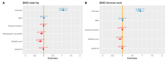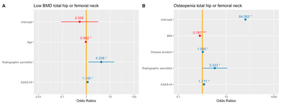 Multivariate logistic regression to evaluate the factors associated with low BMD (A) and osteopenia (B) in the total hip or femoral neck. ASAS-HI: ASAS Health Index; BMI: Body Mass Index. *, p-value < 0.05; ***, p-value < 0.001.