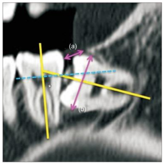 Figure 1. Measurement and classification of the impacted third molars in cone-beam computed tomography [12]. The spatial relationship was subcategorized based on the angle between the long axis of the third molar and the adjacent second molar as follows (yellow lines and an asterisk mark): (1) mesioangular (11° to 79°), (2) horizontal (80° to 100°), (3) vertical (−10° to 10°), (4) distoangular (−11° to −79°), or (5) reverse, where the crown of the third molar was more root-oriented than horizontal. The depth was classified based on the line connecting the cementoenamel junction of the adjacent second molar (dotted blue line) as follows: (1) more than half of the third molar crown was above the CEJ of the adjacent second molar; (2) less than half of the third molar crown was above the CEJ of the adjacent second molar; (3) more than half of the third molar crown positioned superior to the mid-level of the adjacent second molar root; (4) the third molar crown level inferior to that mentioned above. The ramus relationship/space available was subcategorized based on the ratio between the distance from the ascending ramus to the distal of the second molar (a) and the diameter of the impacted third molar (b) (pink arrows). An eruption space (a/b) larger than two-thirds of the distance was defined as (1), between one-third and two-thirds—as (2), and smaller than one-third—as (3).