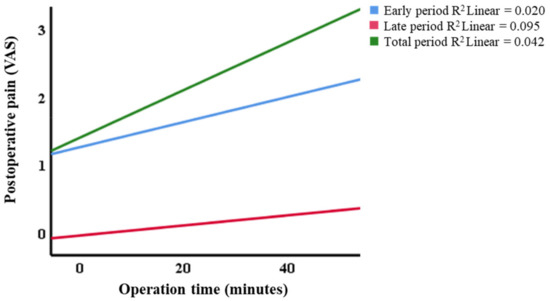 Figure 2. Postoperative pain level depending on the operation time. Postoperative pain score showed a significant correlation with the operation time in the early (R2 = 0.020, p = 0.035), late (R2 = 0.095, p = 0.000), and total (R2 = 0.042, p = 0.006) periods.