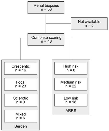 A total number of 53 renal biopsies with confirmed renal involvement of AAV were identified. Among them, complete systematic histological scoring of tubular injury lesions was available for 48/53 (90.6%) renal biopsies (Figure 1). Histopathological subgroupings revealed 16/48 (33.3%) crescentic, 23/48 (47.9) focal, 3/48 (6.3%) sclerotic, and 6/48 (12.5%) mixed class ANCA GN [7]. ARRS was high in 8/48 (16.7%), medium in 22/48 (45.8%), and low risk class ANCA GN in 18/48 (37.5%) cases (Figure 1) [28].