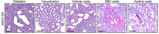 Tubular injury lesions in ANCA GN: Representative photomicrographs with tubular injury lesions are shown (scale bars: 100 μm). Abbreviations: ANCA, anti-neutrophil cytoplasmic antibodies; GN, glomerulonephritis; RBC, red blood cell.
