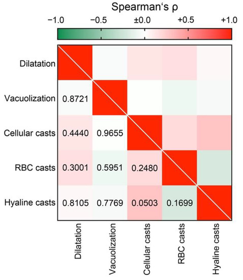 Direct association between tubular injury lesions in AAV: Association between distinct tubular injury lesions are shown by heatmap reflecting mean values of Spearman’s ρ, values of p are shown for each association. Abbreviations: AAV, ANCA-associated vasculitis; RBC, red blood cell.