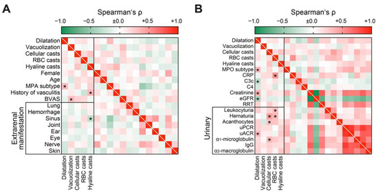 Distinct clinical parameters and laboratory markers associate with tubular injury lesions in AAV: (A) Association between tubular injury lesions and clinical parameters are shown by heatmap reflecting mean values of Spearman’s ρ, asterisks indicate p < 0.05. (B) Association between tubular injury lesions and laboratory markers are shown by heatmap reflecting mean values of Spearman’s ρ, asterisks indicate p < 0.05. Abbreviations: AAV, ANCA-associated vasculitis; BVAS, Birmingham Vasculitis Activity Score; C3c, complement factor 3 conversion product; C4, complement factor 4; CRP, C-reactive protein; eGFR, glomerular filtration rate (CKD-EPI); GN, glomerulonephritis; IgG, immunoglobulin G; MPA, microscopic polyangiitis; MPO, myeloperoxidase; RBC, red blood cell; RRT, renal replacement therapy; uACR, urinary albumin-to-creatinine ratio, uPCR, urinary protein-to-creatinine ratio.