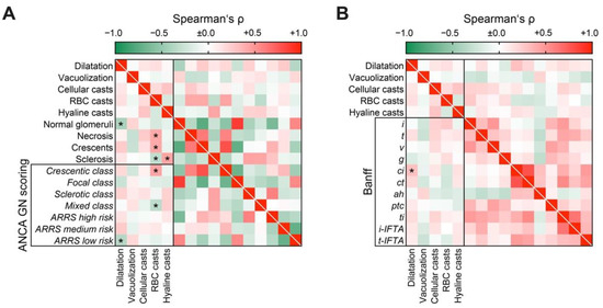 Acute tubular injury patterns correlate with active ANCA GN, whereas tubular lesions reflecting later stages of kidney disease correlated with chronic glomerular lesions: (A) Association between tubular injury lesions and histopathological, findings are shown by heatmap reflecting mean values of Spearman’s ρ, asterisks indicate p < 0.05. (B) Association between tubular injury and interstitial lesions analogous to the Banff scoring system are shown by heatmap reflecting mean values of Spearman’s ρ, asterisks indicate p < 0.05. Abbreviations: ah, arteriolar hyalinosis; ANCA, anti-neutrophil cytoplasmic antibodies; ci, interstitial fibrosis; ct, tubular atrophy; g, glomerulitis; GN, glomerulonephritis; i, interstitial inflammation; i-IFTA, inflammation in IFTA; t, tubulitis; ptc, peritubular capillaritis; RBC, red blood cell; ti, total inflammation; t-IFTA, tubulitis in IFTA; v, intimal arteritis.