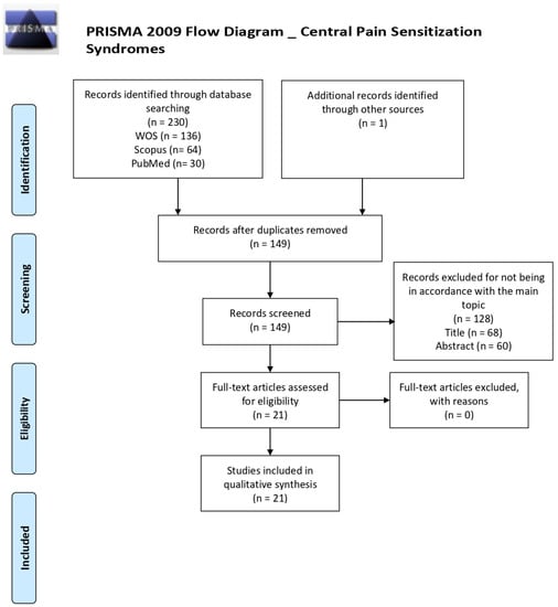 Central pain sensitization (CPS) results from neuronal plasticity that involves structural and functional changes in the central nervous system (CNS). These changes generate a sustained state of hyperexcitability and excessive synaptic efficiency in the CNS neurons involved in sensory and nociceptive processing [,]. CPS can occur both at the brain [,] and spinal cord level []. In the latter case, CPS promotes activity in ascending modulatory pain pathways [] and/or dysfunction of descending inhibitory pathways []. CPS explains the occurrence of spontaneous pain, and maintenance thereof, as well as hypersensitivity to innocuous (allodynia) or low-intensity (hyperalgesia) stimulation in the so-called central pain sensitization syndromes (CPSS) [,,]. According to the classification developed by M. B. Yunus on central sensitization syndromes (2007; 2009; 2015), those that involve the experience of chronic pain could be considered as CPSS [,,]. In this way, the CPSS under study were: fibromyalgia syndrome (FMS), irritable bowel syndrome (IBS), chronic tension-type headache (CTTH), migraine, interstitial cystitis (IC), and temporomandibular disorder (TMD). In the following lines, a brief explanation of each CPSS will be provided in order to facilitate the understanding of the review.