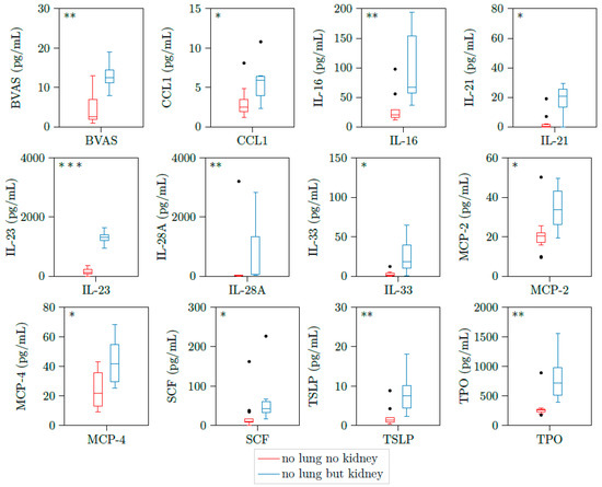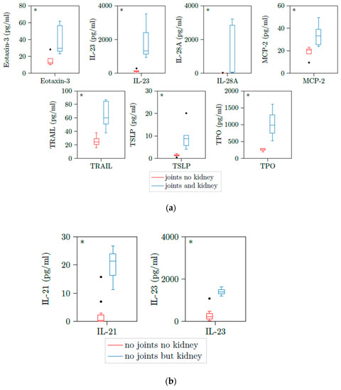 | Cytokine | Active (Kidney Affected) Mean (min–max); n = 7 | Inactive (Kidney Not Affected) Mean (min–max); n = 16 | * = p < 0.05; ** = p < 0.01; *** = p < 0.001; n.s. = not significant |
