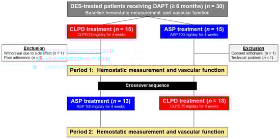 The sample size calculation was derived from an earlier experience [13], where adjunctive clopidogrel in addition to aspirin relatively increased the RHI value by 19.7% in CAD patients compared to the control group. At least 26 patients were needed to detect a relatively difference of 19.7% with a power of 90%, a two-sided α error = 0.05, and a standard deviation (SD) of 0.30. Considering a 15% drop-out rate, we enrolled 30 patients.