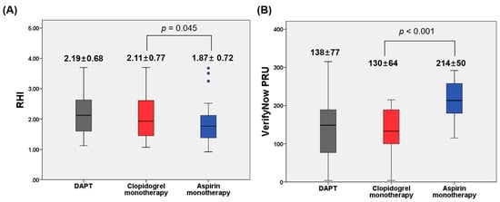 After pooling data from individual antiplatelet treatment together (78 sets), we compared arterial stiffness and hemostatic measurements according to the status of endothelial function (Table S1). Clopidogrel administration (DAPT or clopidogrel monotherapy) was associated with an increased chance of normal endothelial function (RHI ≥ 2.1) compared to aspirin monotherapy (44.2% vs. 19.2%: OR, 3.331; 95% CI, 1.089 to 10.192; p = 0.030).