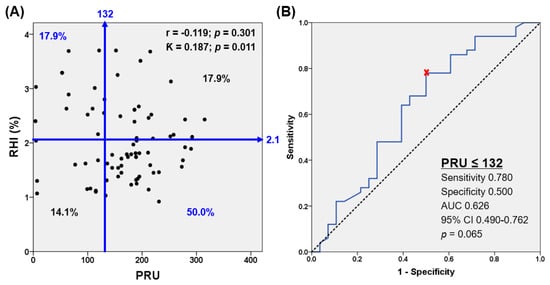 The correlation between PRU and RHI was weak (r = −0.119) (Figure 3A). In the ROC curve analysis to assess the PRU value corresponding to normal endothelial function (RHI ≥ 2.1), ‘PRU ≤ 132′ was identified as the matched cutoff (area under curve, 0.626; 95% CI, 0.490 to 0.762; p = 0.065), with a sensitivity of 78.0% and a specificity of 50.0% (Figure 3B).