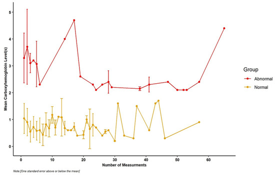 Among the entire cohort of 5708 patients with COVID-19 admitted to Houston Methodist Hospital System, only 431 patients had single or multiple measurements of COHb levels. One hundred fifteenpatients had elevated COHb levels, for an incidence of 26.7% [115/431] (95% CI, 22.6–31.1%). The mean initial COHb was 1.51 ± 1.22%. There was a decreasing trend with COHb levels in an abnormal or elevated COHb group throughout measurements (p-trend = 0.01). However, the trend in the COHb level remained the same for the normal COHb group (p-trend > 0.05) (Figure 1).