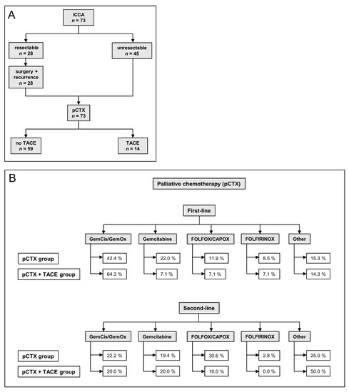 Treatment algorithm and chemotherapy regimens of the study patients. (A) Flow chart illustrating the treatment course of patients. iCCA: intrahepatic cholangiocarcinoma, pCTX: palliative chemotherapy, TACE: transarterial chemoembolization. (B) Flow chart indicating first- and second-line palliative chemotherapy (pCTX) of both groups. TACE: transarterial chemoembolization, GemCis: gemcitabine/cisplatin, GemOx: gemcitabine/oxaliplatin.